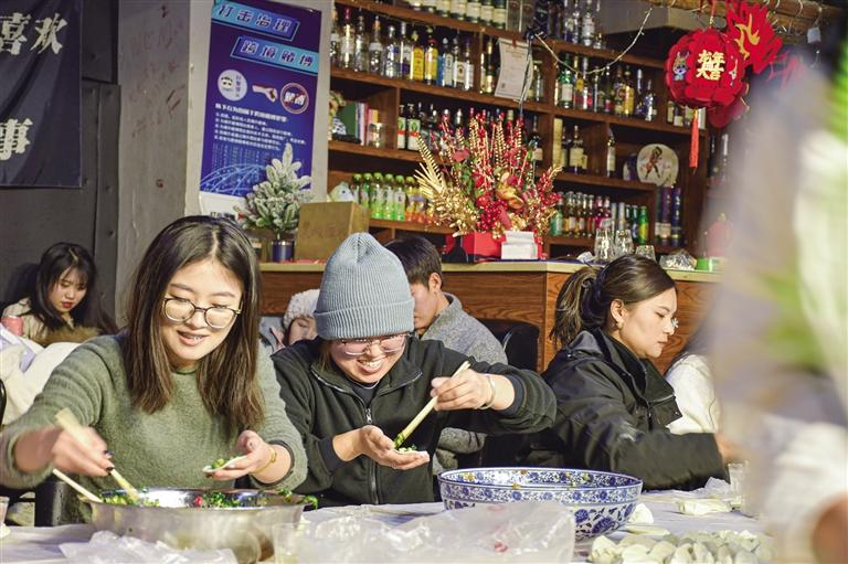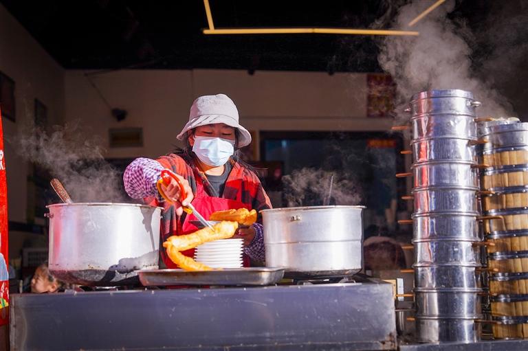 早上九點(diǎn),楊三姐的早餐店里生意正好,她一邊炸著韭菜盒子一邊忙碌地招呼著顧客?!皨輯?,幫我把油條剪成小段?!鄙习嘧鍎⑴縼淼降昀铮I了一份豆?jié){油條。她說:“早上冷,我喜歡把油條泡進(jìn)滾燙的豆?jié){里吃,很暖和?!闭艋\揭開,一股股蒸騰的熱氣撲面而來,包子面皮軟糯,內(nèi)里餡料飽滿,趁熱咬上一口,濃郁的香味喚醒還在沉睡的味蕾。楊三姐告訴記者:“除了面點(diǎn),也有很多人愛點(diǎn)豌雜面等粉面,早上喝口熱湯才舒服。”