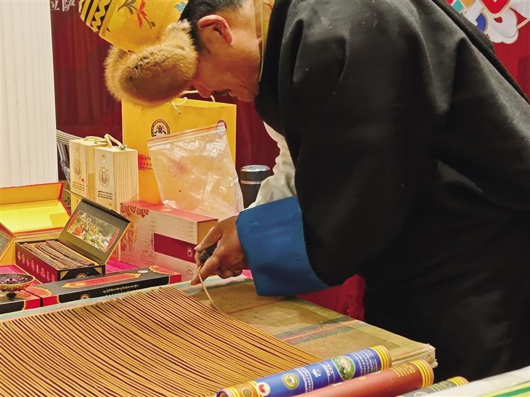 展銷活動現(xiàn)場,一股淡雅香氣彌漫開來,藏香展位上,線香靜靜燃燒。拉薩市級非物質(zhì)文化遺產(chǎn)代表性傳承人加措正在制作藏香,吸引不少人駐足觀看。市民鄭先生說:“以前只見過藏香成品,第一次看制作過程,很驚喜。春節(jié)申遺成功后,非遺受關(guān)注更多,希望西藏非遺好物能被更多人了解!”