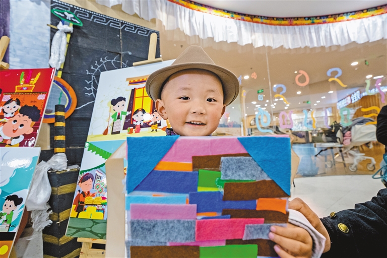 孩子展示自己制作的手工邦典。記者 阿旺尼瑪 攝