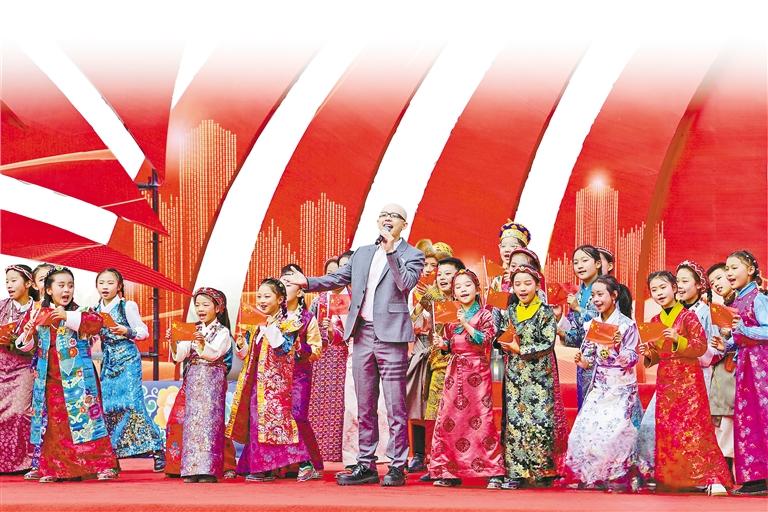 歌手平安與西藏珠峰少年合唱團帶來歌曲《我愛你中國》。 (其余圖片均由記者 唐斌 白瑪澤旺 王敏 丹增群培 旦增蘭澤 攝)