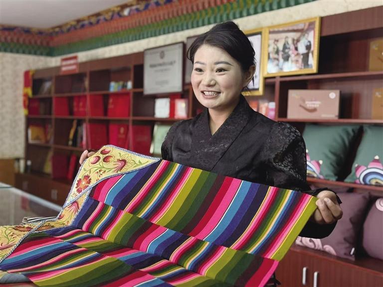 “好的技藝和原料是基礎(chǔ),創(chuàng)新的產(chǎn)品是敲門磚,走好這兩步,再打響知名度,我們的經(jīng)濟效益才能更上一層樓?!睘榱俗尭嗳肆私獍畹?,旦增卓嘎帶著合作社的產(chǎn)品頻繁亮相藏博會等平臺,用現(xiàn)場編織演示和文化講解,讓世界讀懂“彩虹圍裙”的故事。