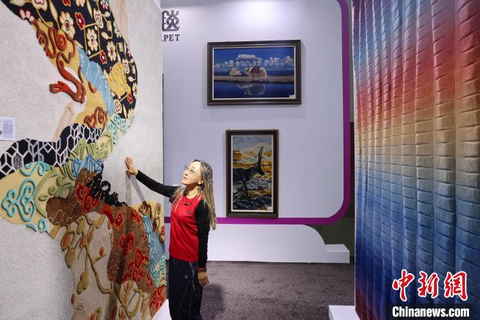 圖為青海參展商介紹展出的地毯。中新社記者 薛蒂 攝