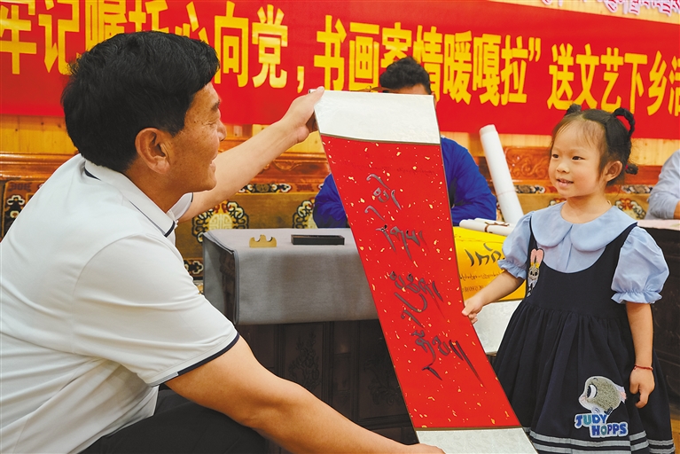 圖為村黨支部書記邊巴教小姑娘識讀書法家寫的“民族團結”藏文書法。記者 謝筱純 攝