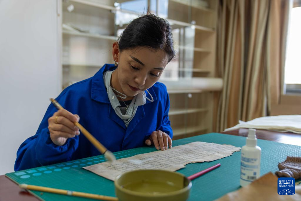 8月13日,西藏自治區(qū)古籍保護中心古籍修復員次仁央宗在對古籍進行除霉。新華社記者 旦增尼瑪曲珠 攝 ??