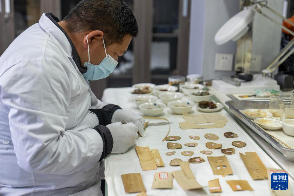 5月25日,布達拉宮貝葉經實驗性修復小組實驗室工作人員在對貝葉進行處理。新華社記者 旦增尼瑪曲珠 攝 ??