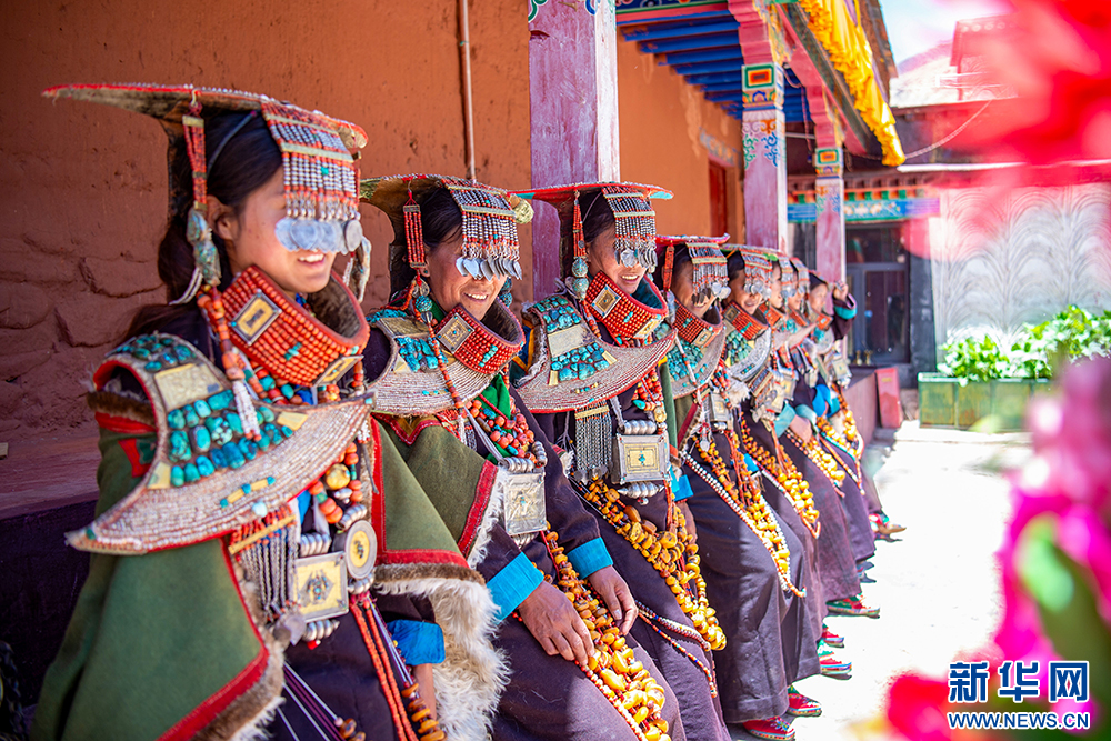 身著“普蘭服飾”的普蘭縣科迦村村民(6月10日攝)。“普蘭服飾”,主要由袍子、披風、頭飾、項鏈、腰帶、耳墜、靴子組成。其中最精美、最獨特的為婦女服飾,外形設計如同孔雀開屏,被譽為“孔雀”服飾,一套重達20多公斤,裝飾有黃金、白銀、蜜蠟、珊瑚、綠松石等。新華網(wǎng) 旦增努布 攝