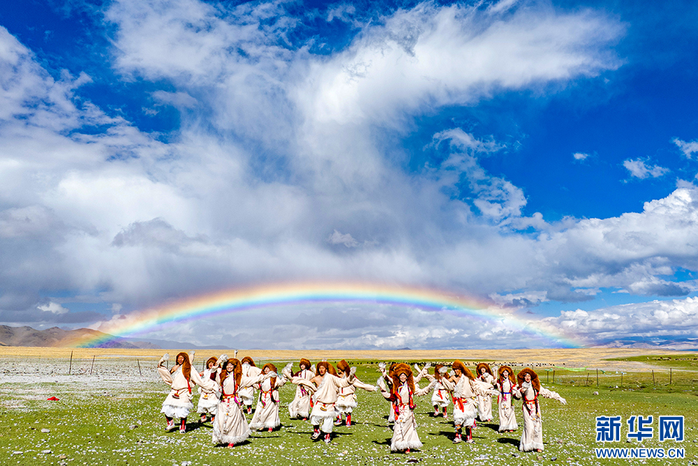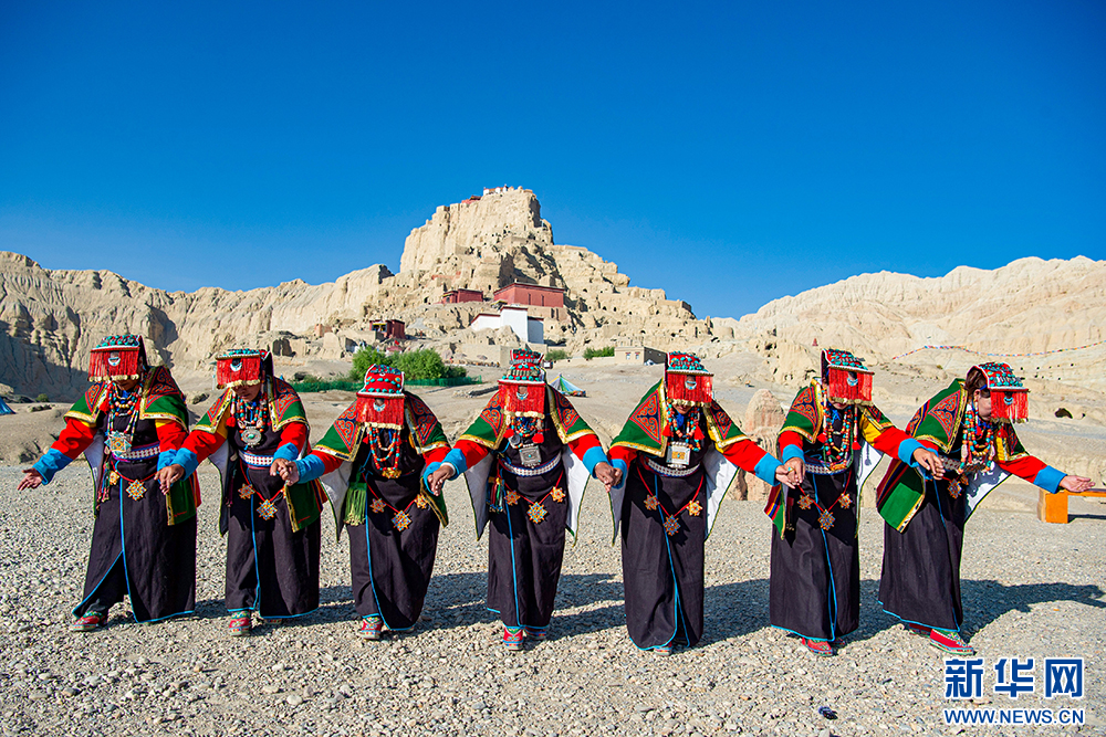 札達縣群眾在古格王國遺址腳下表演“宣舞”(6月12日攝)?!靶琛笔俏鞑匕⒗锩耖g傳統(tǒng)舞蹈,融合藏戲、舞蹈、說唱等傳統(tǒng)民間藝術(shù),內(nèi)容涵蓋禮儀、風俗、節(jié)慶等。2008年,被列入國家級非物質(zhì)文化遺產(chǎn)名錄。新華網(wǎng) 旦增努布 攝