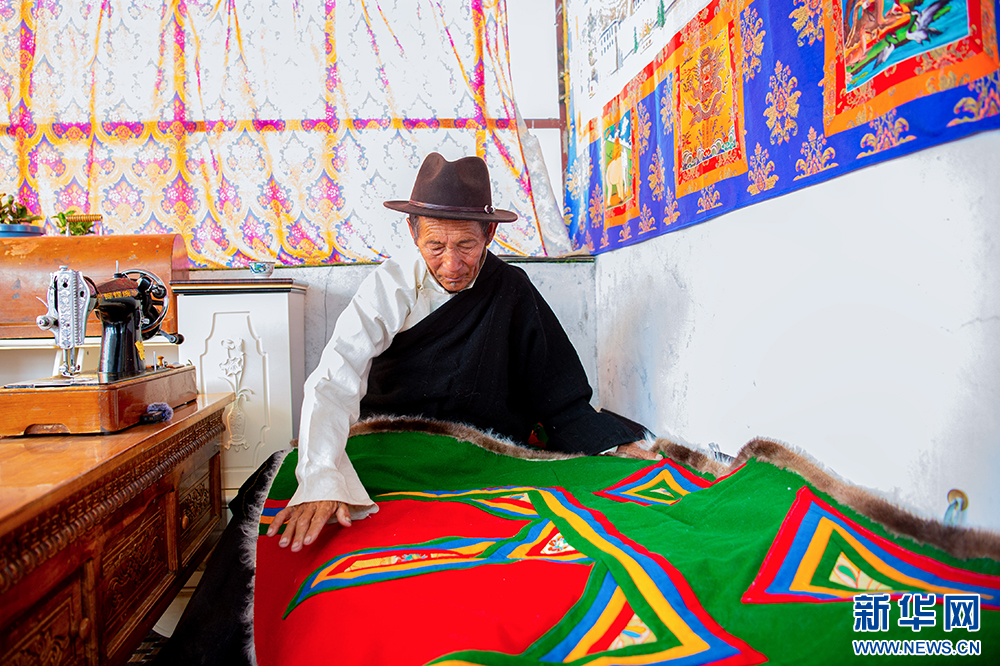 “噶爾傳統(tǒng)服飾”地區(qū)級代表性傳承人石達次仁在介紹自治區(qū)級非物質(zhì)文化遺產(chǎn)“噶爾傳統(tǒng)服飾”(6月14日攝)?!案翣杺鹘y(tǒng)服飾”由羊羔皮和呢子內(nèi)外兩面縫制而成,形狀為正方形,制作簡易,內(nèi)里均為純白色的羊羔皮,羊羔皮既保暖又有裝飾性。新華網(wǎng) 旦增努布 攝