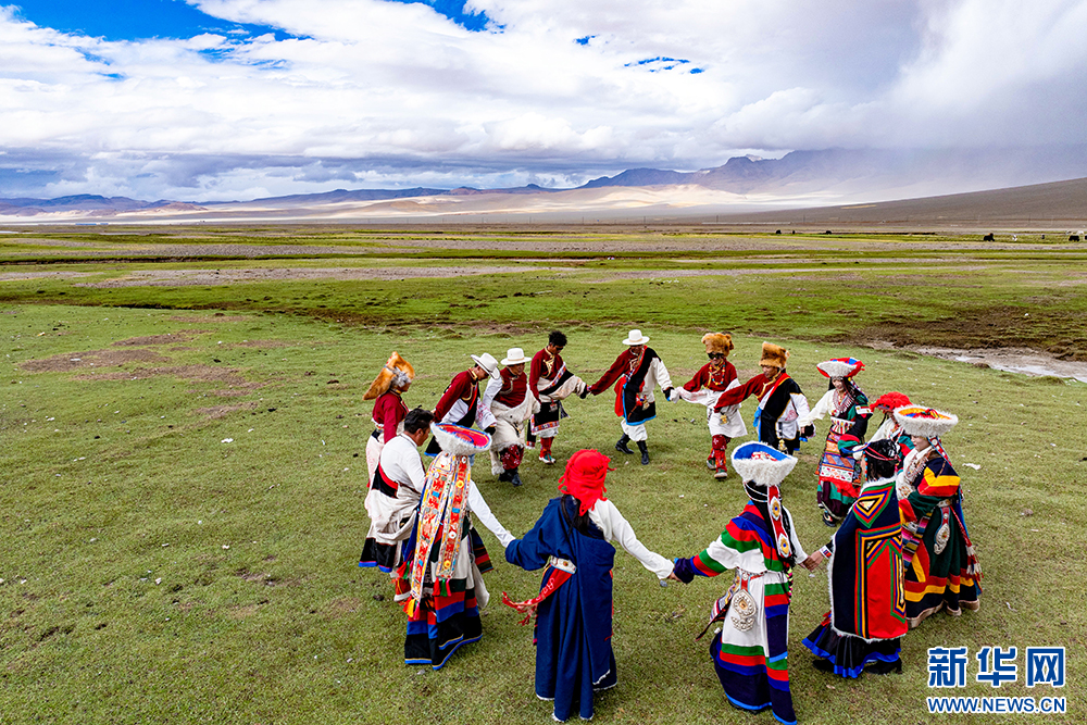 措勤縣藝術(shù)團在表演自治區(qū)級非物質(zhì)文化遺產(chǎn)磁石“帕”卓(6月23日攝)。該舞蹈動作優(yōu)美歡快、充滿動感,帶有彈性舞步。近年來,措勤縣將磁石“帕”卓改編為課間操進校園,讓學生感受當?shù)胤沁z魅力。新華網(wǎng) 旦增努布 攝