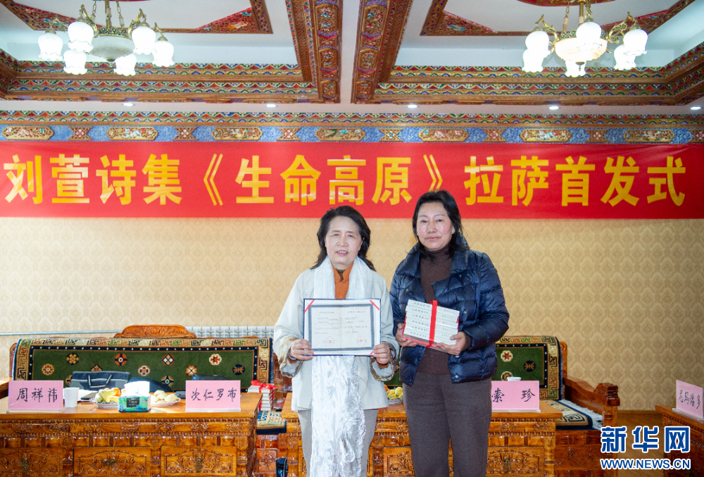 1月15日,在活動(dòng)現(xiàn)場劉萱向西藏自治區(qū)作協(xié)、西藏自治區(qū)圖書館捐贈(zèng)了《生命高原》詩集。新華網(wǎng) 旦增努布 攝
