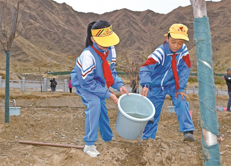 拉薩市第一小學(xué)學(xué)生在城關(guān)區(qū)慈覺林植樹點(diǎn)參加春日植樹活動。記者 潘多 洛桑 攝