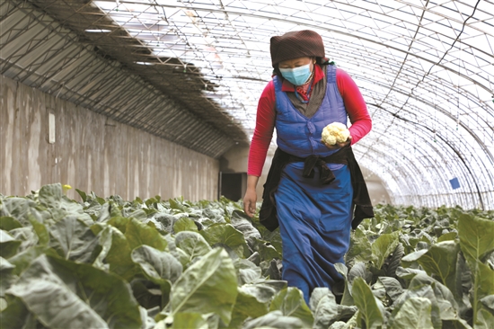 圖為當(dāng)?shù)厝罕娫谀窆たh現(xiàn)代農(nóng)業(yè)示范園溫室大棚收花菜。 拉薩融媒記者 貢嘎來松攝