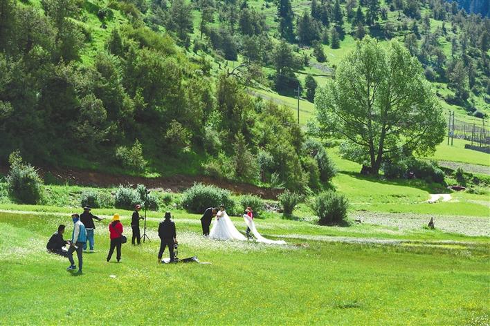 圖為一對(duì)新人在伊日峽谷拍攝婚紗照。記者 扎巴旺青 攝