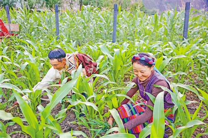 圖為察瓦龍鄉(xiāng)目巴村村民德青永宗(右)在玉米地里除草。記者 王珊 攝
