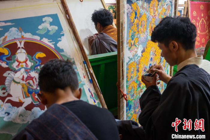 西藏昌都丁青縣象雄東朵唐卡畫派繪畫班的學員們學習唐卡繪制技藝。(資料圖) 江飛波 攝