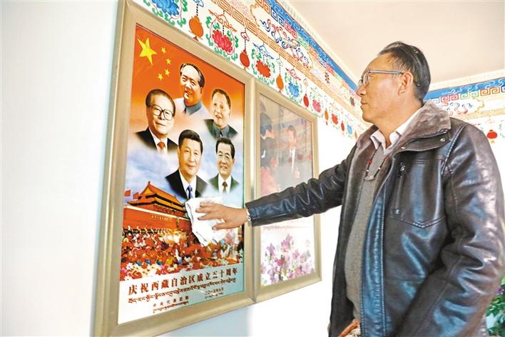 巴桑頓珠在擦拭領(lǐng)袖像。