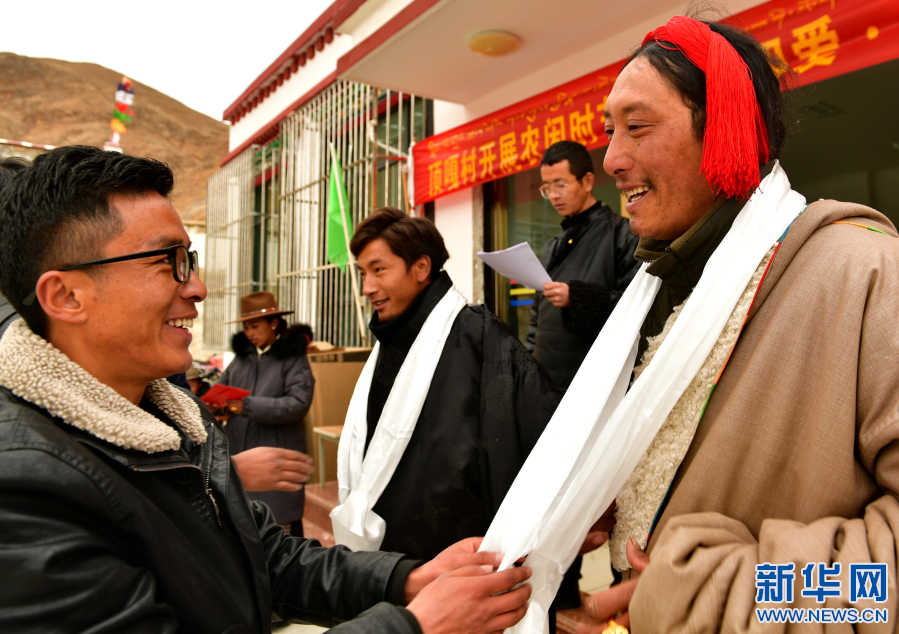 西藏拉薩市堆龍德慶區(qū)德慶鄉(xiāng)頂嘎村駐村第一書記扎西達(dá)杰(左)為參加文娛活動(dòng)的獲獎(jiǎng)村民頒獎(jiǎng)并佩戴哈達(dá)(2019年2月28日攝)。新華社記者 張汝鋒 攝