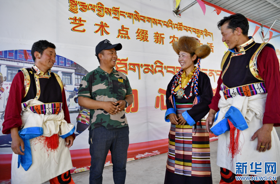 西藏山南市扎囊縣桑耶鎮(zhèn)乃卡村第一書記、駐村工作隊(duì)隊(duì)長次仁羅布(左二)和村文藝演出隊(duì)演員交流(2020年7月7日攝)。新華社記者 張汝鋒 攝