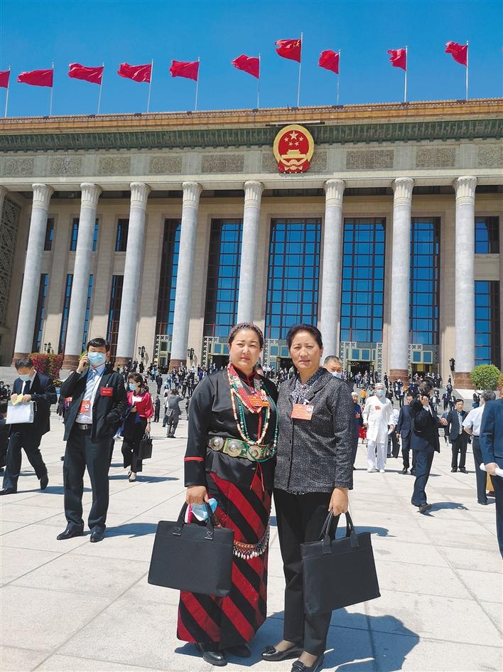 圖為貢覺曲珍(左)在會(huì)場(chǎng)外與西藏參會(huì)委員合影留念。(圖片由貢覺曲珍提供)