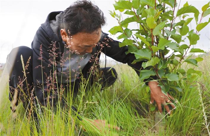 索朗羅布在檢查樹的長勢(2020年8月8日攝)。新華社記者 覺果 攝