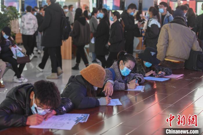 求職者在招聘會上填寫個人信息?!∝暩聛硭?攝