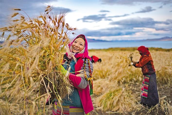 9月23日,西藏那曲市尼瑪縣文部鄉(xiāng)文部南村村民開鐮收割農(nóng)田里的青稞。文部鄉(xiāng)文部南村位于當(dāng)惹雍錯湖畔,海拔4645米。文部鄉(xiāng)一帶獨特的自然環(huán)境,在以牧區(qū)為主的藏北,造就了這片罕見的農(nóng)田。