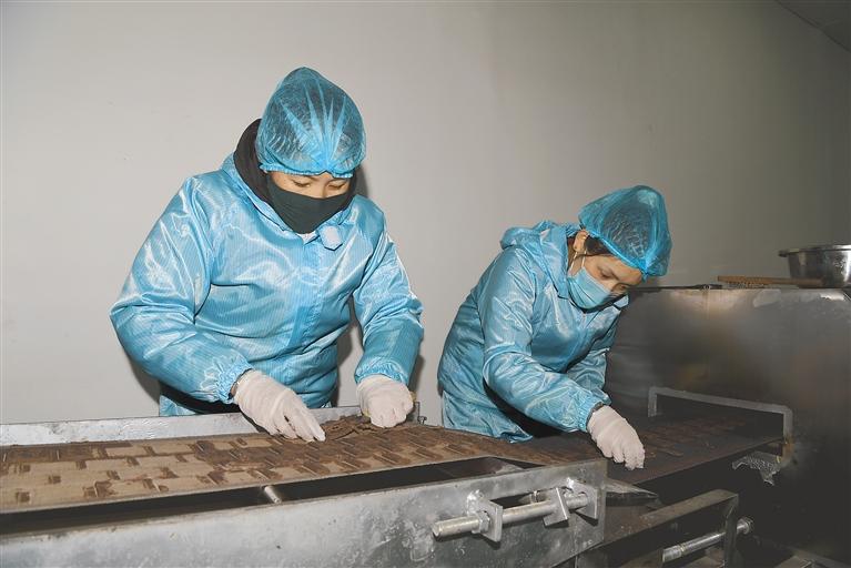 圖為定結縣江嘎熱電子商務服務中心的員工在生產雞爪谷餅干。記者 李洲 攝