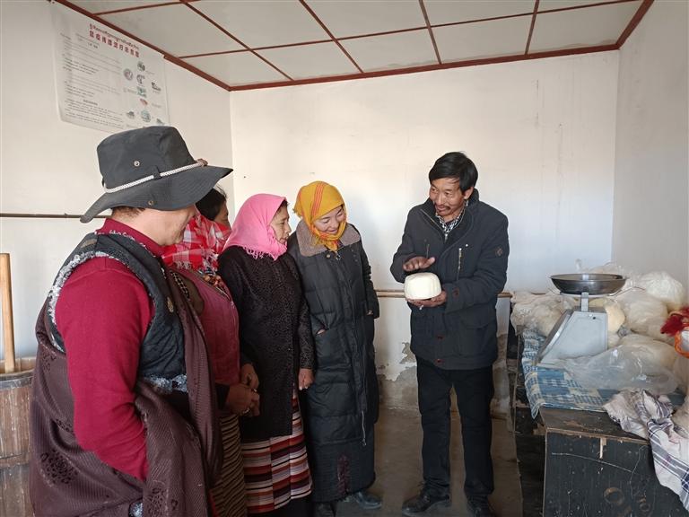 圖為旦巴念扎在指導合作社投工投勞人員制作奶制品。記者 張宇 攝
