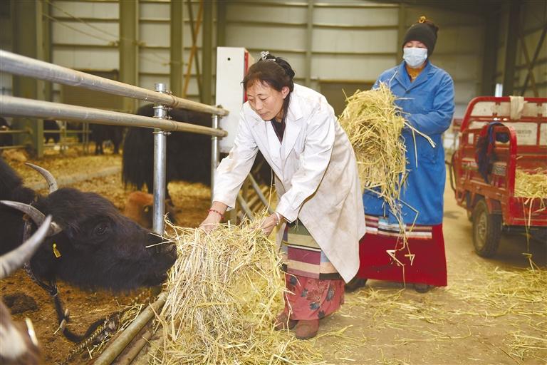 圖為在西藏娘亞牦牛養(yǎng)殖產(chǎn)業(yè)發(fā)展有限責(zé)任公司標準化養(yǎng)殖場內(nèi),員工給娘亞牦牛投喂飼草料。那曲采訪報道組 攝