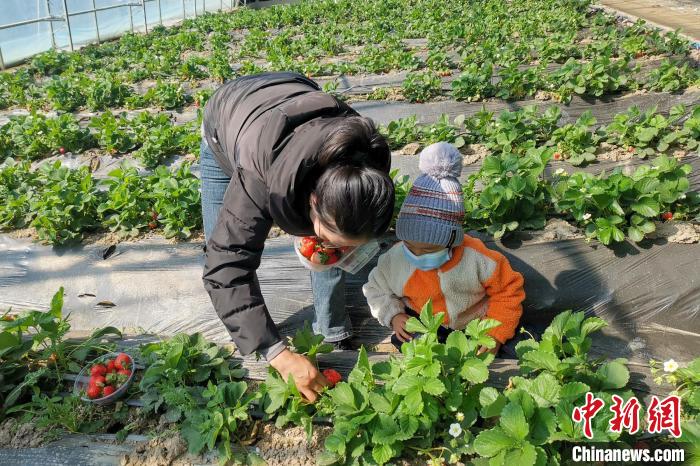 家長帶孩子體驗草莓采摘?!堄裣?攝