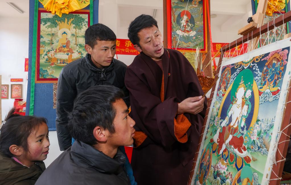 西繞尼瑪(右一)在講解關于唐卡繪制的知識(1月11日攝)。新華社記者 姜帆 攝