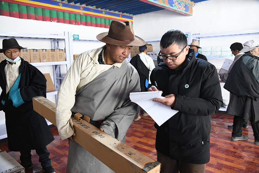 日喀則市昂仁縣多白鄉(xiāng)多白村村民在國家電網在藏首個“電力愛心超市”用積分兌換物品(3月30日攝)。國網西藏電力供圖 索娜央金 攝