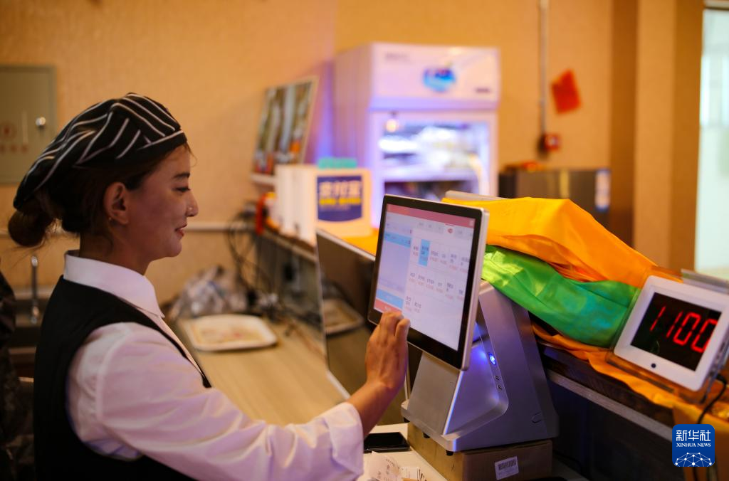 多爾格村村民尼達卓瑪在合作社開辦的茶館前臺收銀(7月11日攝)。新華社記者 姜帆 攝