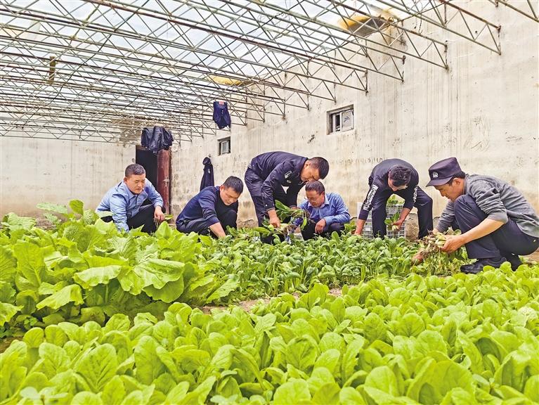 這是薩瑪達邊境派出所民警在大棚里采摘蔬菜。記者 王莉 攝