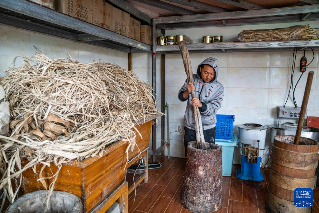在西藏米林市羌納鄉(xiāng)西嘎門巴村,南迦巴瓦童螺嘎布工藝品農(nóng)民專業(yè)合作社的工作人員正在制作藏紙(7月26日攝)。新華社記者 孫非 攝