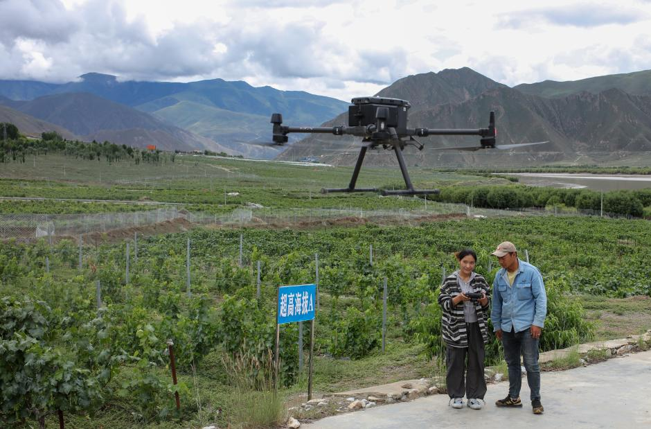 7月26日,桑日縣一家葡萄酒企業(yè)的員工曲珍(左)在葡萄園里向技術(shù)員何志榮學(xué)習(xí)使用農(nóng)用無(wú)人機(jī)。[詳細(xì)]