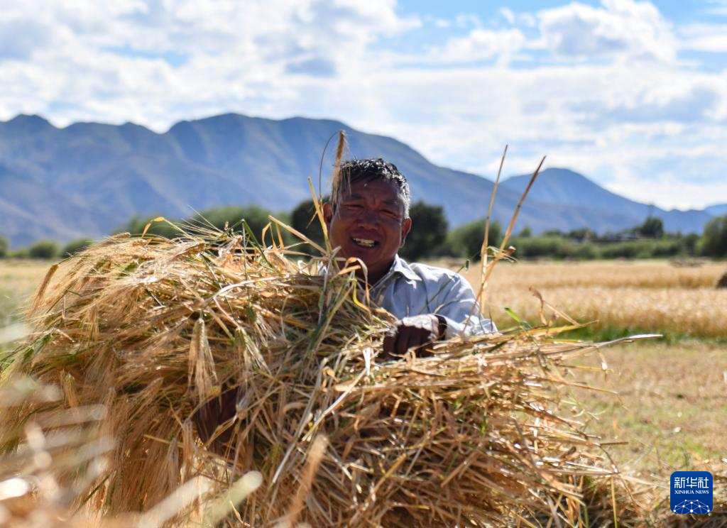西藏日喀則市年楚河流域是西藏糧食的主產(chǎn)區(qū)之一,今年雨水豐沛,糧食長勢喜人,大地鋪金,農(nóng)民喜迎豐收。