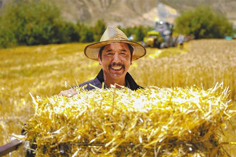 正值秋收時節(jié),山南市扎囊縣桑普村麥田里一片繁忙的景象,轟隆的機收聲猶如一串歡快的音符,奏響了豐收的樂章。“現(xiàn)在有了機械非常方便,你看,一眨眼的功夫這塊地就收完了?!贝迕癜渍渲钢矍暗柠溙镎f道。近年來,鄉(xiāng)親們靠著黨的支農(nóng)惠農(nóng)政策,不斷提升農(nóng)業(yè)機械化水平,收割效率極大提升。