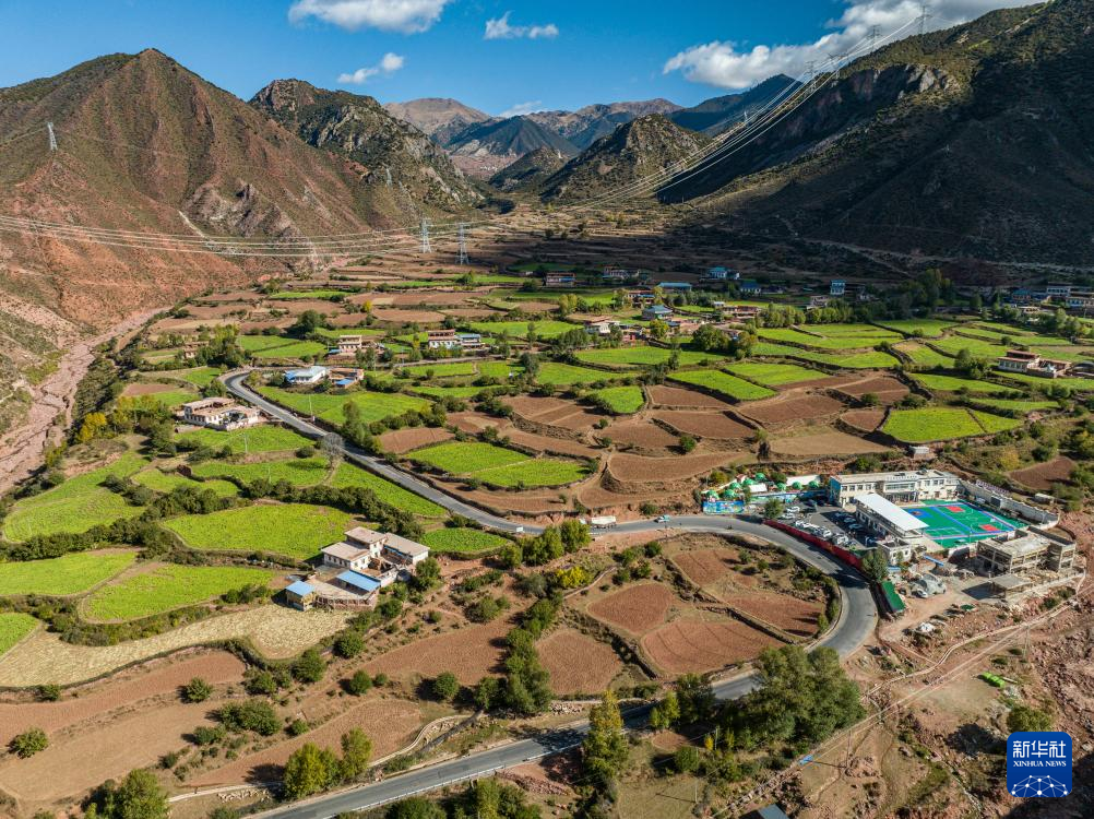 這是10月20日拍攝的西藏芒康縣如美鎮(zhèn)拉烏村(無(wú)人機(jī)照片)。圖中公路為國(guó)道318線。新華社記者 孫非 攝