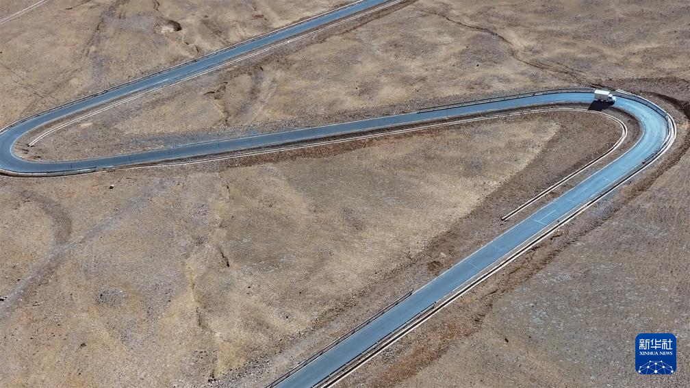 申扎縣供銷合作社為馬躍鄉(xiāng)貝嘎四村偏遠(yuǎn)鄉(xiāng)鎮(zhèn)果蔬配送試點(diǎn)項(xiàng)目直銷點(diǎn)配送新鮮果蔬的貨車,行駛在盤山公路上,這個(gè)村距離申扎縣城150公里(無(wú)人機(jī)照片,1月5日攝)。新華社記者 旦增尼瑪曲珠 攝