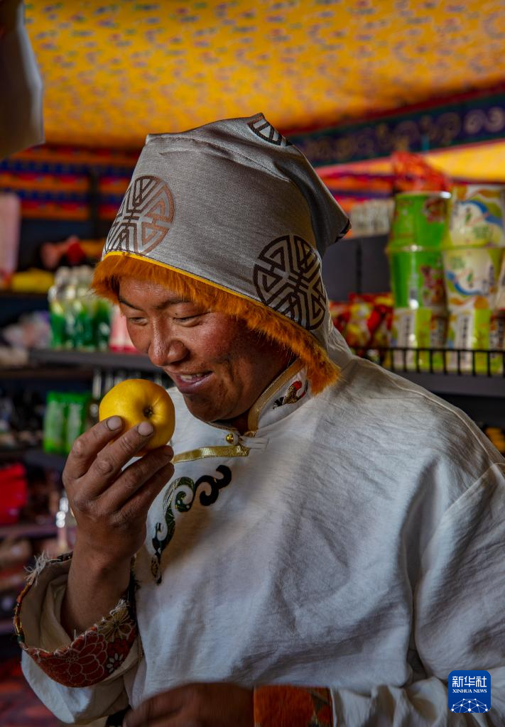 申扎縣馬躍鄉(xiāng)貝嘎四村偏遠(yuǎn)鄉(xiāng)鎮(zhèn)果蔬配送試點(diǎn)項(xiàng)目直銷點(diǎn)店主西熱加措拿起供銷合作社配送來(lái)的水果(1月5日攝)。新華社記者 姜帆 攝