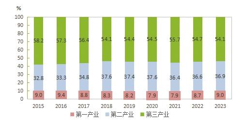 圖2 2015-2023年三次產(chǎn)業(yè)增加值占地區(qū)生產(chǎn)總值比重
