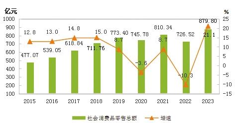 全年社會(huì)消費(fèi)品零售總額879.80億元,比上年增長(zhǎng)21.1%。按銷售單位所在地分,城鎮(zhèn)消費(fèi)品零售額716.67億元,增長(zhǎng)19.5%;鄉(xiāng)村消費(fèi)品零售額163.14億元,增長(zhǎng)28.8%。按消費(fèi)形態(tài)分,商品零售789.54億元,增長(zhǎng)19.9%;餐飲收入90.27億元,增長(zhǎng)32.4%。