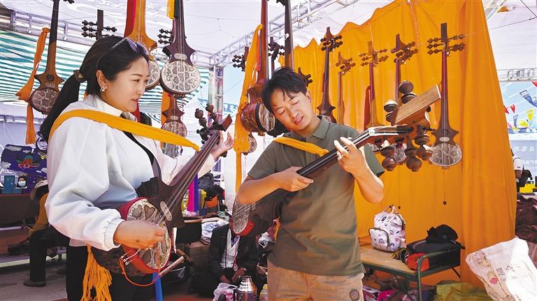 圖為在日喀則高原農(nóng)特產(chǎn)品及尼泊爾特色產(chǎn)品展示展銷(xiāo)活動(dòng)上,商家向顧客介紹扎念琴。