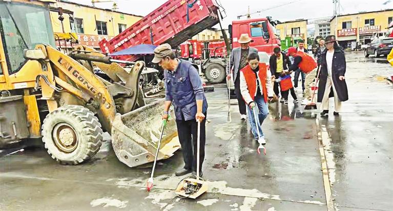 巴宜區(qū)尼池社區(qū)的工作人員身穿紅馬甲,手拿鐵鍬、掃帚等工具對林芝市快修市場附近的垃圾雜物進(jìn)行清理,“黨建引領(lǐng)聚合力 環(huán)境整治我先行”的標(biāo)語迎風(fēng)飄揚;