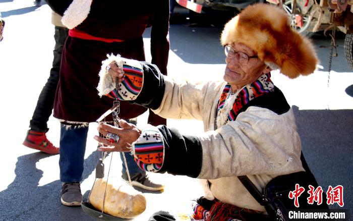 圖為申扎縣畜產(chǎn)品展銷會(huì)現(xiàn)場(chǎng)上,牧民正出售酥油。(資料圖)那曲市申扎縣委宣傳部供圖