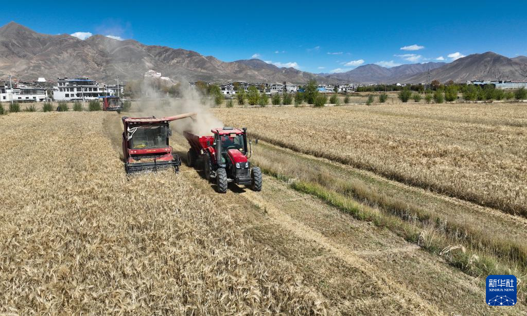 西藏日喀則市江孜縣江熱鄉(xiāng)班覺(jué)倫布村農(nóng)機(jī)服務(wù)農(nóng)民專業(yè)合作社的社員使用農(nóng)機(jī)收獲青稞(10月16日攝)。新華社記者 晉美多吉 攝