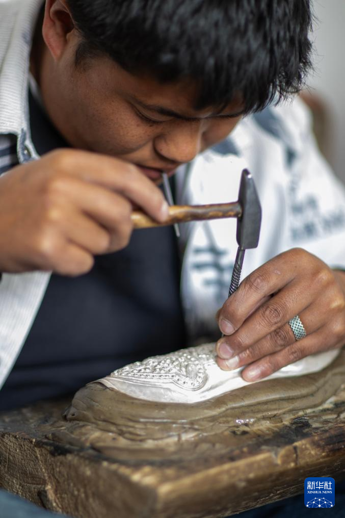 3月6日,扎西吉彩的手工匠人在鏨刻銀器。新華社記者 姜帆 攝