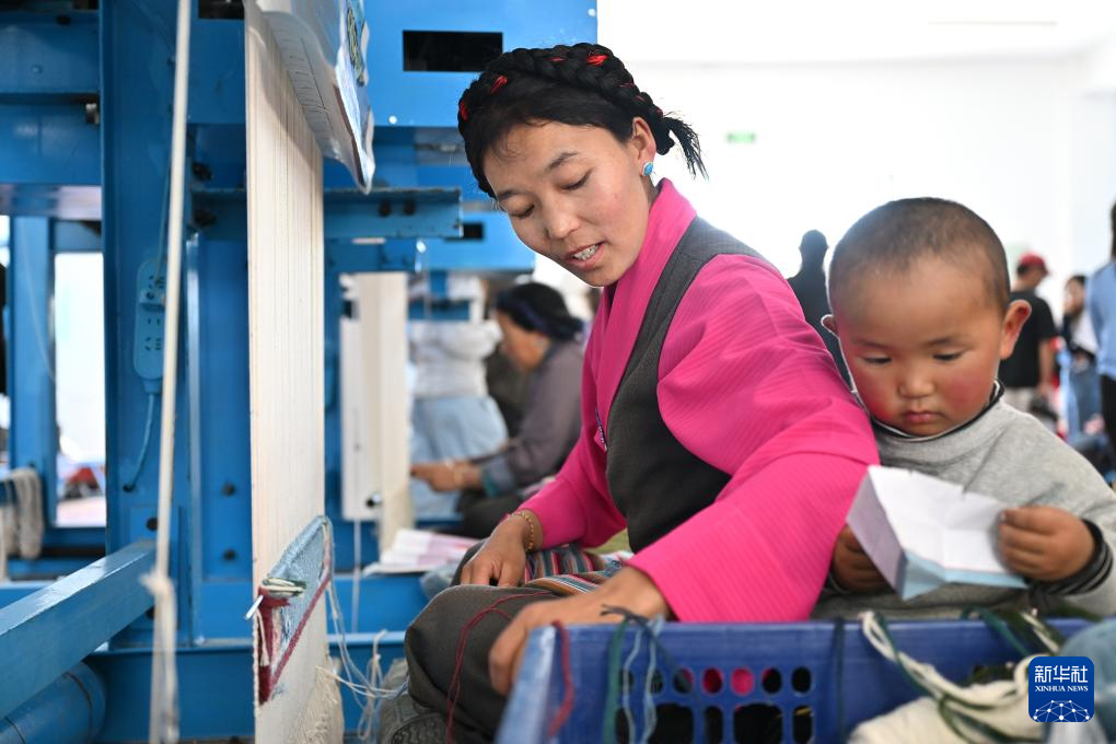 7月18日,江孜藏毯文化發(fā)展有限責(zé)任公司的員工次仁卓瑪帶著兒子在生產(chǎn)車間內(nèi)編織藏毯。新華社記者 李鑫 攝
