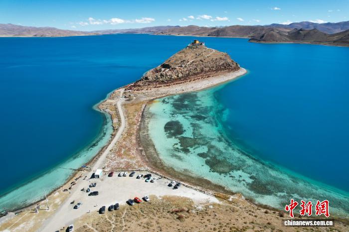 10月25日,西藏羊卓雍錯(cuò)日托寺風(fēng)光。日托寺位于半島上,形成了“古剎”“孤寺”景觀,近年在網(wǎng)絡(luò)平臺(tái)持續(xù)火熱。(無(wú)人機(jī)畫(huà)面)中新社記者 江飛波 攝